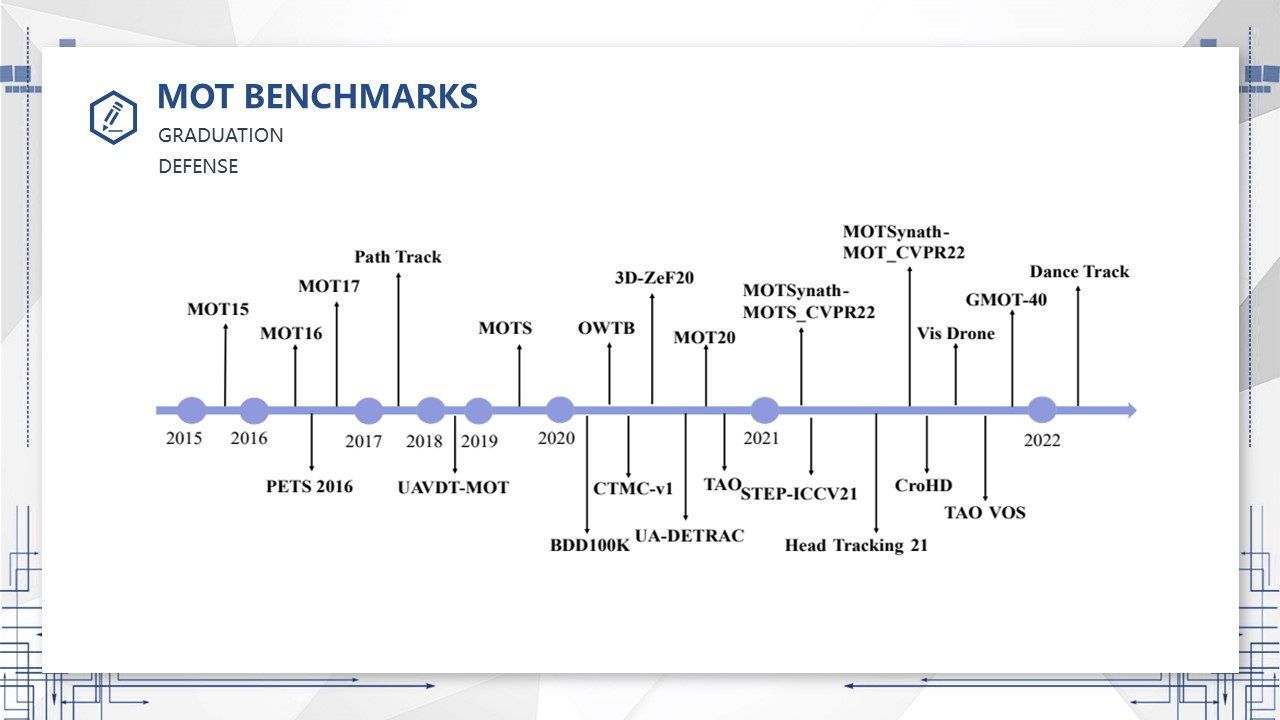 In recent years, numerous MOT public datasets have been released by universities, companies, and research teams, their published annotated videos along with unified hypotheses, annotations, and evaluation tools ensure the feasibility of validating MOT schemes and promote the development of MOT. we list the development history of the multi-objective tracking dataset in a timeline manner. |