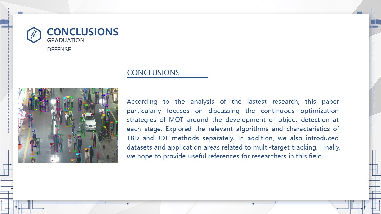 Finally, According to the analysis of the lastest research, this paper particularly focuses on discussing the continuous optimization strategies of MOT around the development of object detection at each stage. Explored the relevant algorithms and characteristics of TBD and JDT methods separately. In addition, we also introduced datasets and application areas related to multi-target tracking. Finally, we hope to provide useful references for researchers in this field. |