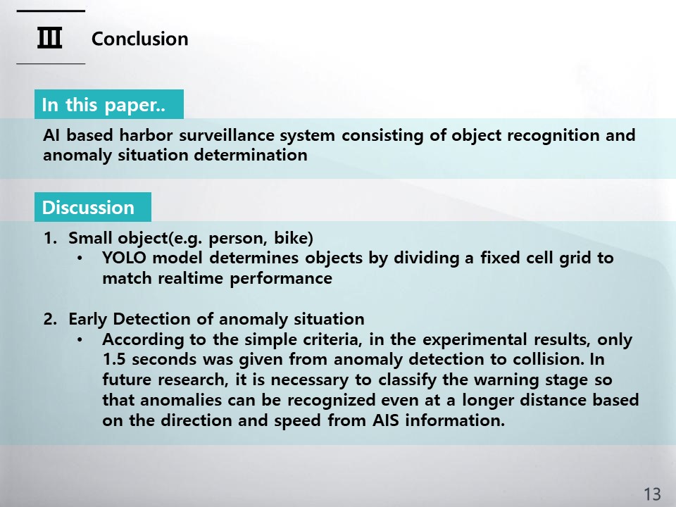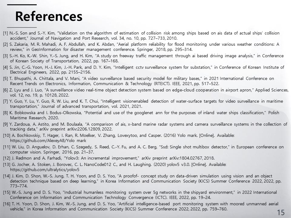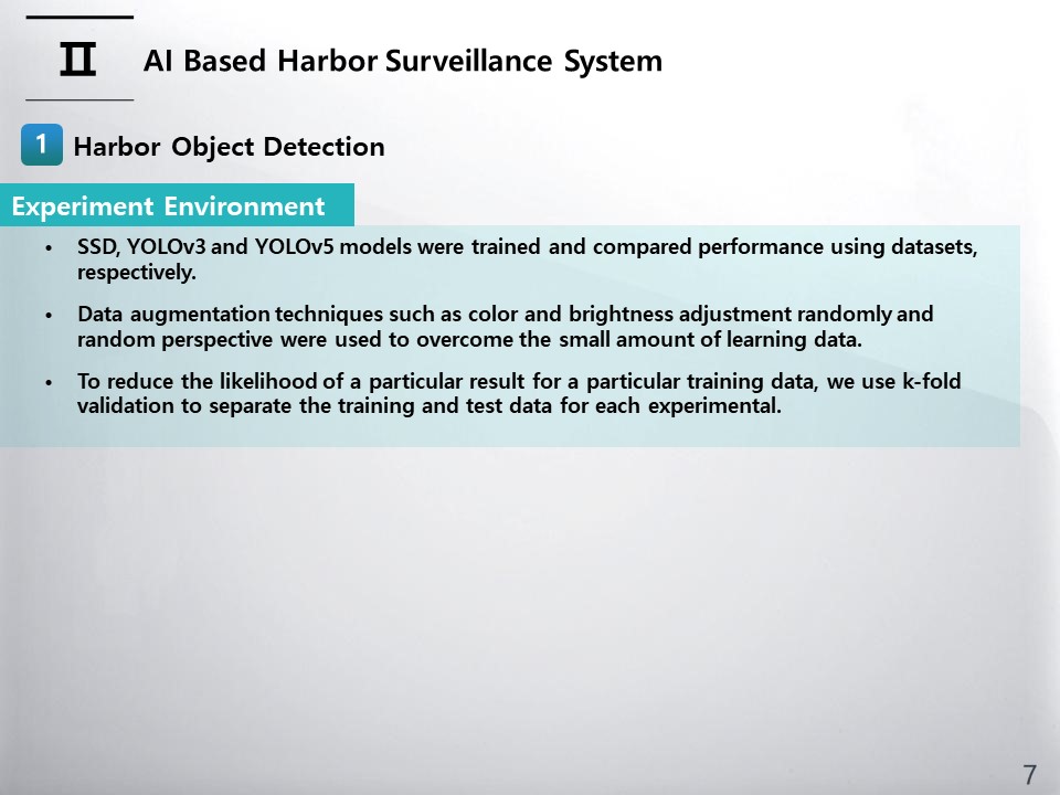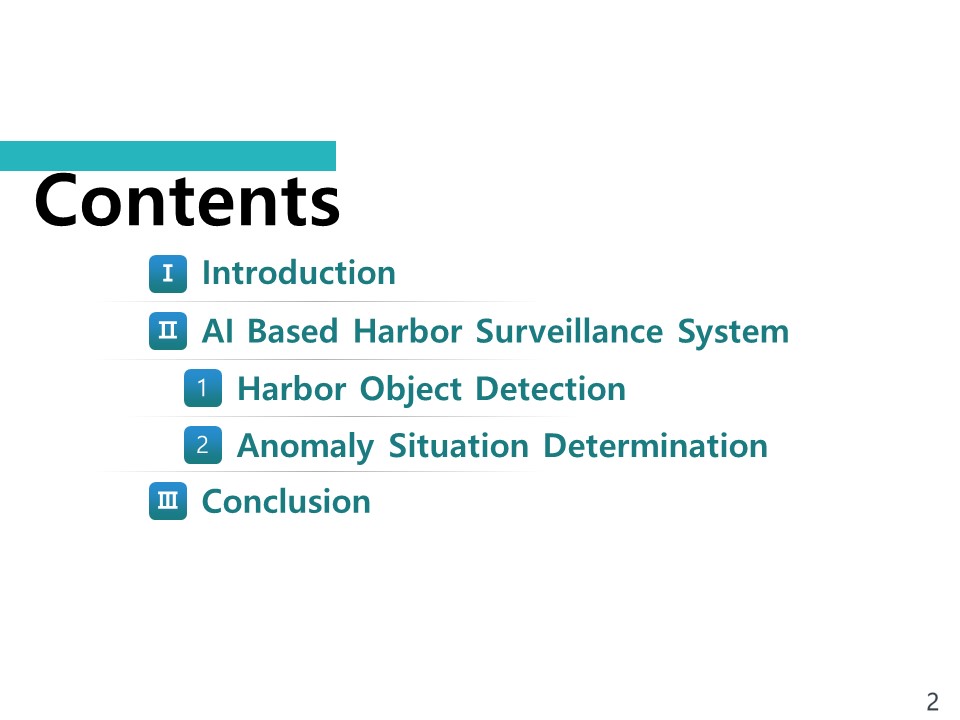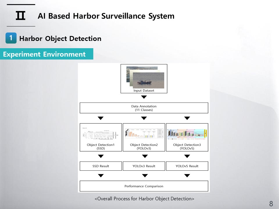 Hello, My name is Dongkoo Shon. I am researcher from the Electronics and Telecommunications Research Institute in South Korea. Today, I will brief you on my research subject on A Study of AI-Based Harbor Surveillance System.