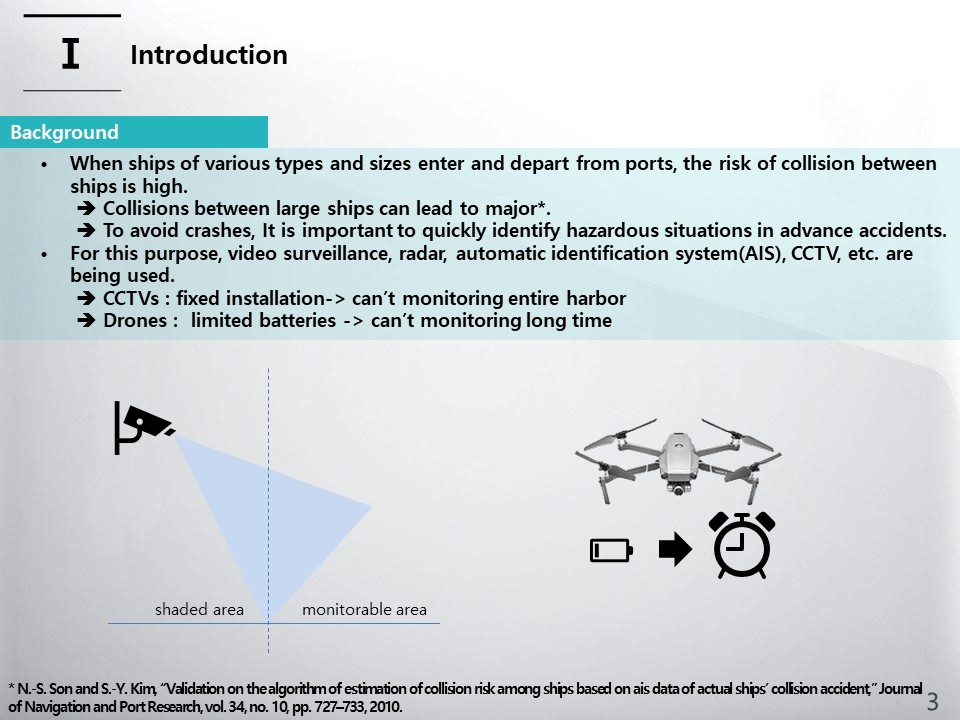 When ships of various types and sizes enter and depart from ports, the risk of collision between ships is high. In particular, collisions between large ships can lead to major accidents. In order to avoid crashes, it is important to quickly identify hazardous situations in advance. For this purpose, video surveillance, radar, automatic identification system (AIS), CCTV, etc. are being used. However, there is a limit to seeing the entire port as CCTV is fixedly installed. Monitoring using drones is also difficult due to limited batteries. As a way to overcome this, the use of An unmanned aerial vehicle (UAV) such as helikite has been proposed.