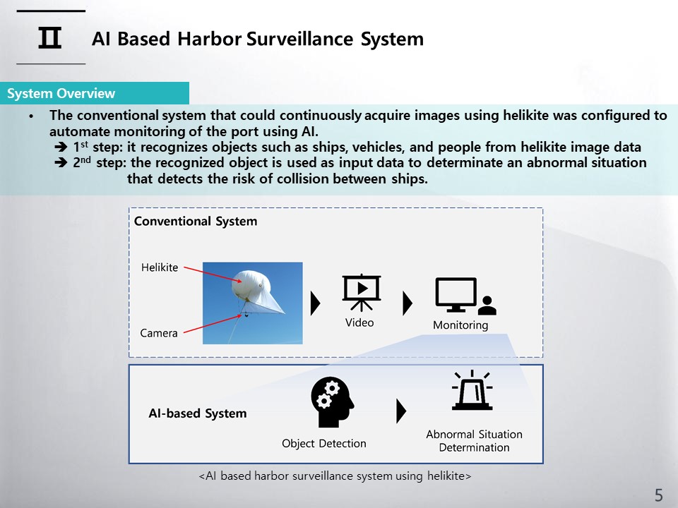This slide shows an overview of a video-based harbor surveillance system. The conventional system that could continuously acquire images using helikite was configured to automate monitoring of the port using AI. Harbor surveillance automation consists of two main steps. In the first step, it recognises objects such as ships, vehicles, and people from helikite image data. In the second step, the recognized object is used as input data to determinate an abnormal situation that detects the risk of collision between ships.