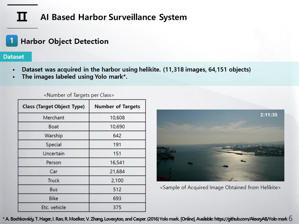 In order to learn the object recognition algorithm, we created an image dataset for training. Ships, vehicles, and people were found in the harbor images acquired through helikite and labeled using Yolo mark. The number of images used is 11,318, and the number of objects in the images is 64,151. table shows the number of objects by object type. Also, a sample of acquired images is shown in right figure.