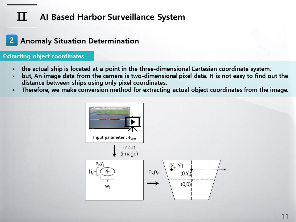 An image data from the camera is two-dimensional pixel data. It is not easy to find out the distance between ships using only pixel coordinates. However, the actual ship is located at a point in the three-dimensional Cartesian coordinate system. If the three-dimensional position of the ship can be determined by transforming the pixel coordinates, the distance between the ships can be calculated. For obtaining 3D coordinates using a single camera, we make two assumptions that all objects are at sea(or ground) level and that the angle of one pixel is the same. The conversion process is schematically illustrated as in figure.