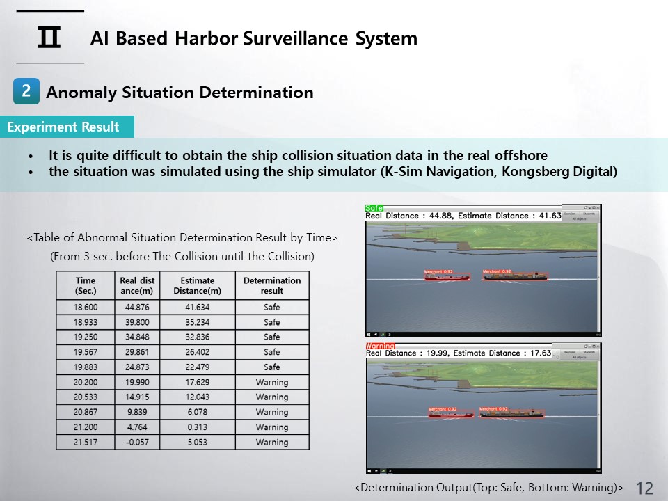The initial distance between the two ships is about 330m, and the simulation was conducted so that the distance between the two ships decreased as the experiment time passed. The actual distance between the ships was calculated from the latitude and longitude of the two ships according to the time obtained from the simulator, and the estimated distance between the two ships, a recognized object, was derived based on the image. The criteria for determination an abnormal situation was classified into a dangerous state if the distance between two ships was less than 20 meters, and a safe state otherwise. Left table shows the results of the abnormal situation judgment experiment from about 3 seconds before the collision. The total length of the experiment is about 21.5 seconds. Although the average distance error between the real distance and the estimated distance is 3.4m, the determination results achieved a high success rate in the experiment environment. Right Figure show two examples of video outputs for safe and warning cases.