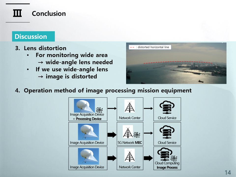 and, If we use a wide-angle lens with a wide field of view of the camera, we can monitor a wide area, but this may cause a problem that the image is relatively severely distorted. In addition to visual problems, this image distortion is especially problematic when physical coordinate numerical calculations such as exact position calculation through image analysis are required. Obtaining the distortion-corrected image coordinates from the distorted image coordinates is a very difficult problem without a closed form solution, and the development of technology to correct images in real-time moving unmanned aerial vehicles such as helikites is a problem to be solved. The operation method of image processing mission equipment can be largely divided into three methods as shown in figure of bottom of slide. The first method is to install an image acquisition and processing device on an aerial device such as a helikite, and obtain image processing results directly from the air device. The second method is to use a centralized image processing center such as a cloud center. And the last method is to operate the cloud at the end of the network, similar to the operation in MEC (Multi-access Edge Computing) of the 5G network. In the case of port monitoring, since it is difficult to build a network infrastructure, additional research is needed on which method is suitable for port monitoring.