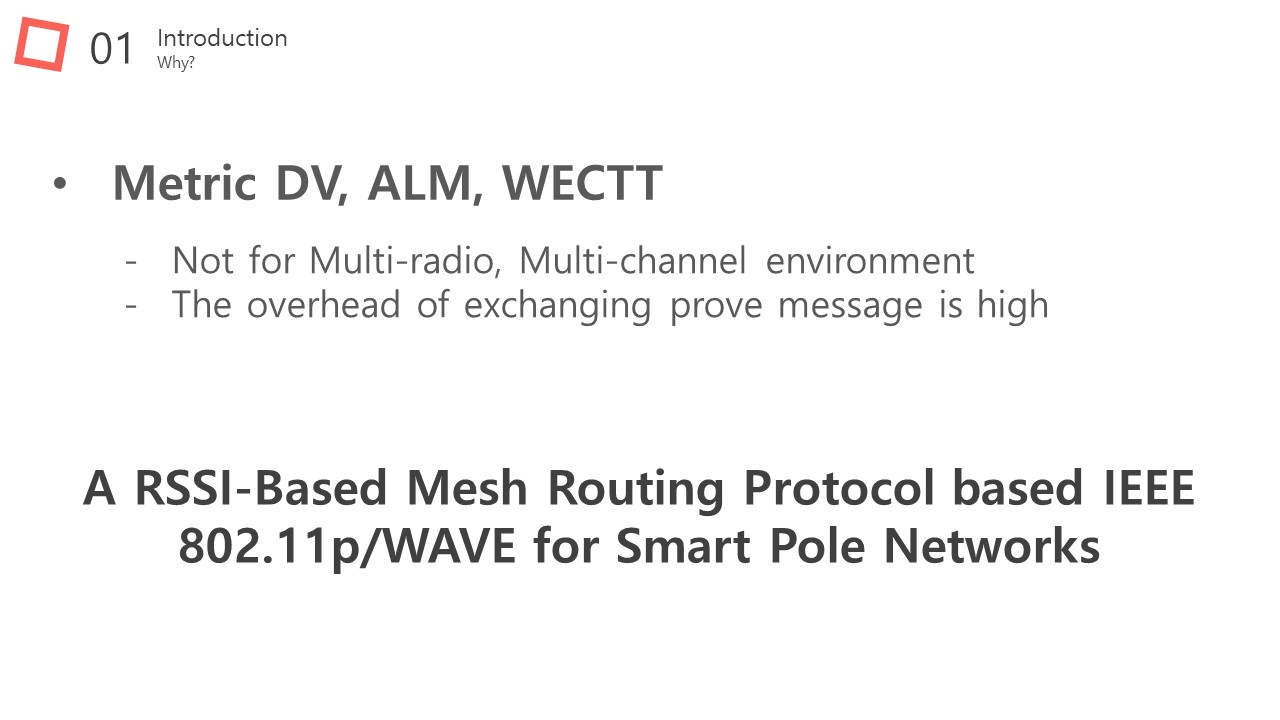 Existing metrics such as Distance Vector and Air Link Metric and WCETT are not suitable for MRMC environments. These are not for multi radio, multi channel environment. Also WCETT need to exchange prove messages to calculate metric. In MRMC environment, periodic exchanging through each channel that incurs huge overhead due to the channel switch delay. So we proposed a RSSI-based mesh routing protocol RBMRP IEEE 802.11p/WAVE based smart pole networks. | |