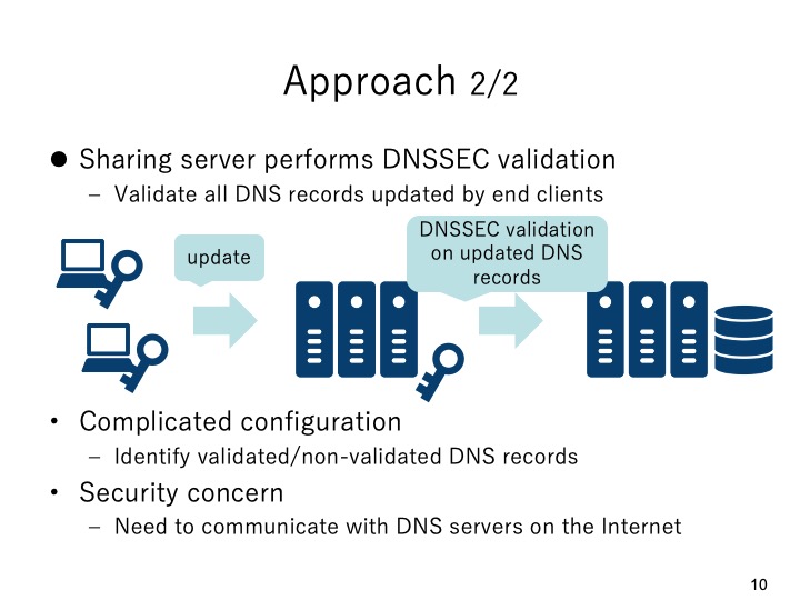 The second approach is that in addition to add a DNS sharing server, the DNS sharing server also performs DNSSEC validation before caching the updated DNS resource records. However, it needs complicated configuration on the DNS sharing server and the DNS sharing server needs to communicate with the external DNS servers in the Internet thus it may cause security concerns. | |