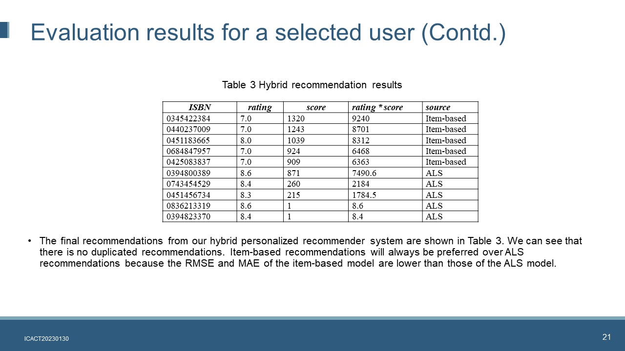 The final recommendations from our hybrid personalized recommender system are shown in Table 3. We can see that there is no duplicated recommendations. Item-based recommendations will always be preferred over ALS recommendations because the RMSE and MAE of the item-based model are lower than those of the ALS model. | |