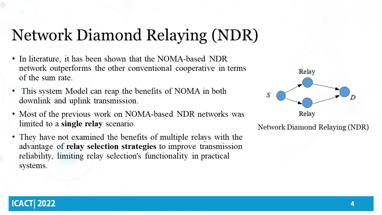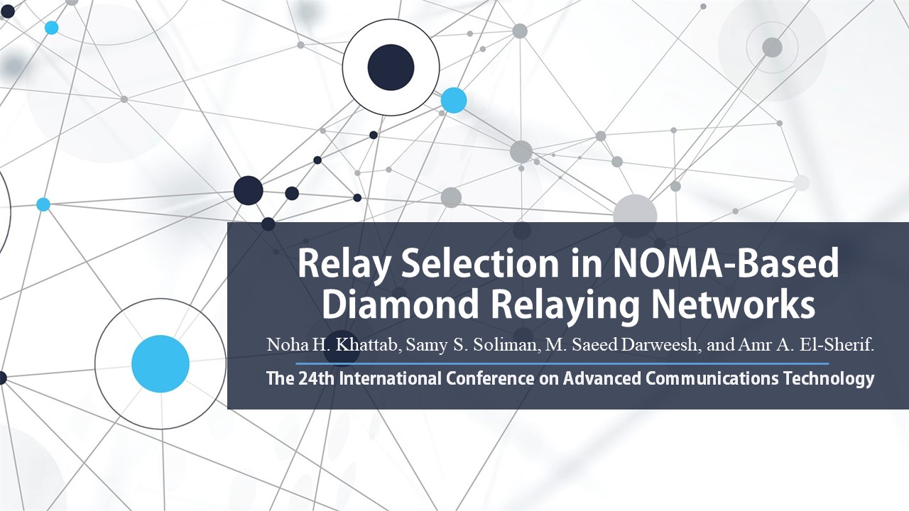 Hi everybody, my name is Noha Hany Khattab. I am pleased to present our work here in ICACT 2022. This work has been done with Dr. Samy Soliman, Dr Saeed Darweesh, and Dr Amr A. El-Sherif. Our presentation today is about Relay Selection in NOMA-Based Diamond Relaying Networks.