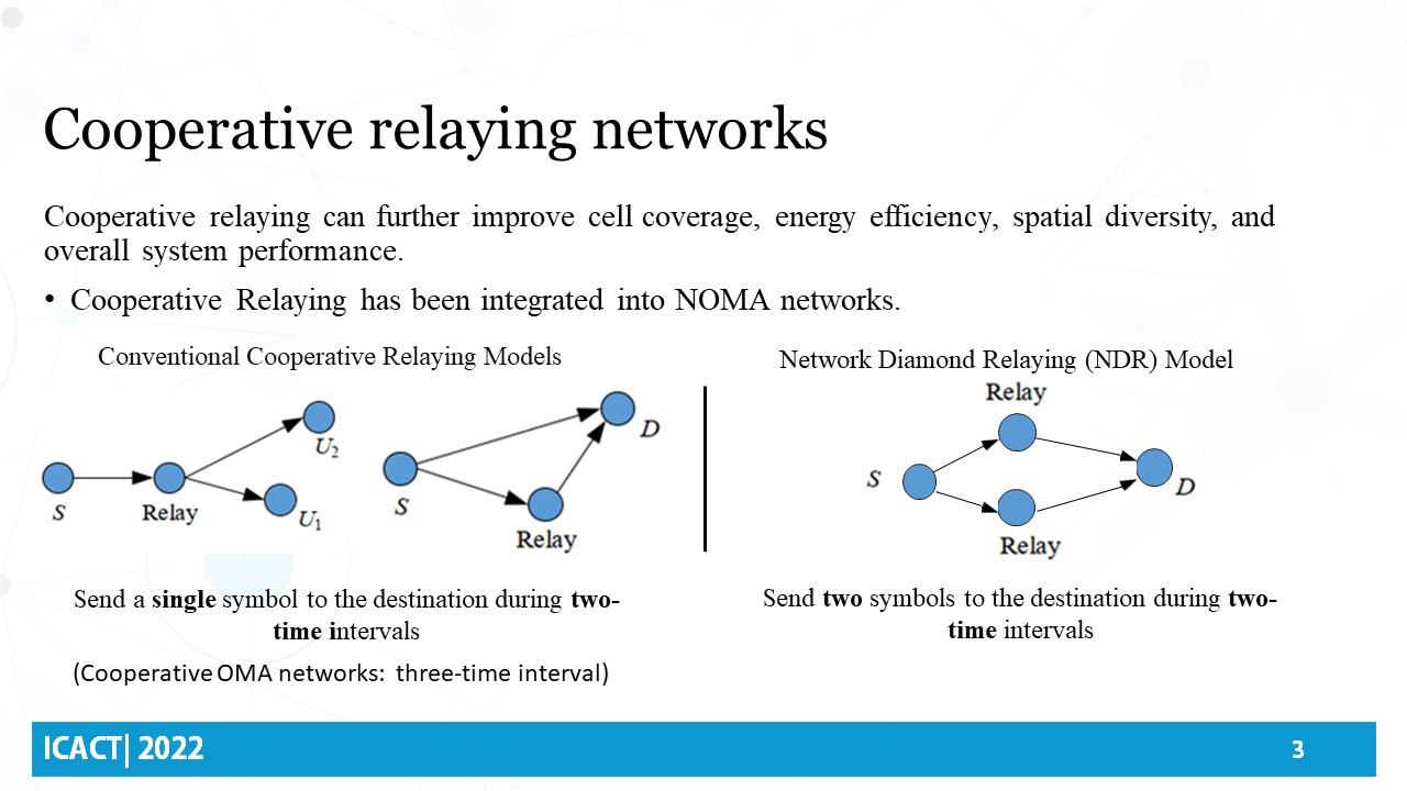 Cooperative relaying can further improve cell coverage, energy efficiency, spatial diversity, and overall system performance. The source could transmit data to the unreachable destination with the help of a relay. Recently, Cooperative Relaying has been integrated into NOMA networks. This integration enables transmitting data symbol to destination in only two-time intervals. Unlike conventional cooperative relaying network models, the NOMA-based network diamond relaying (NDR) model could simultaneously convey two symbols to the destination within only two-time transmission phases, thus increasing the multiplexing gain.