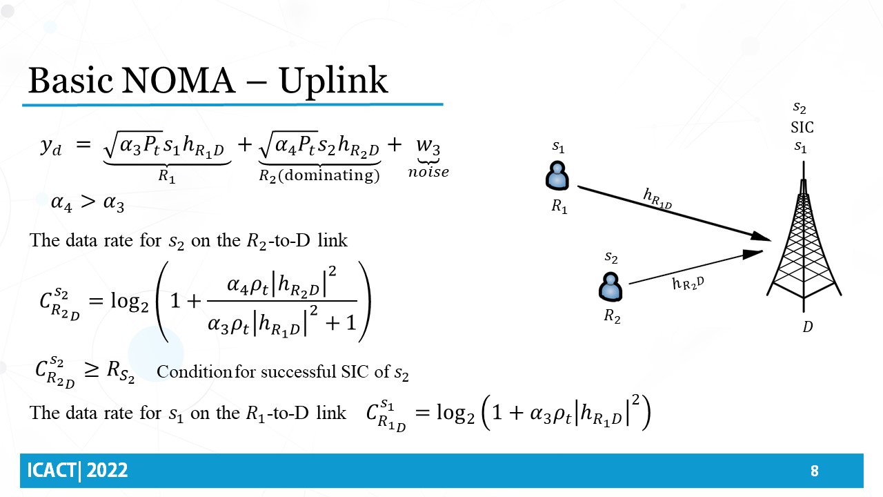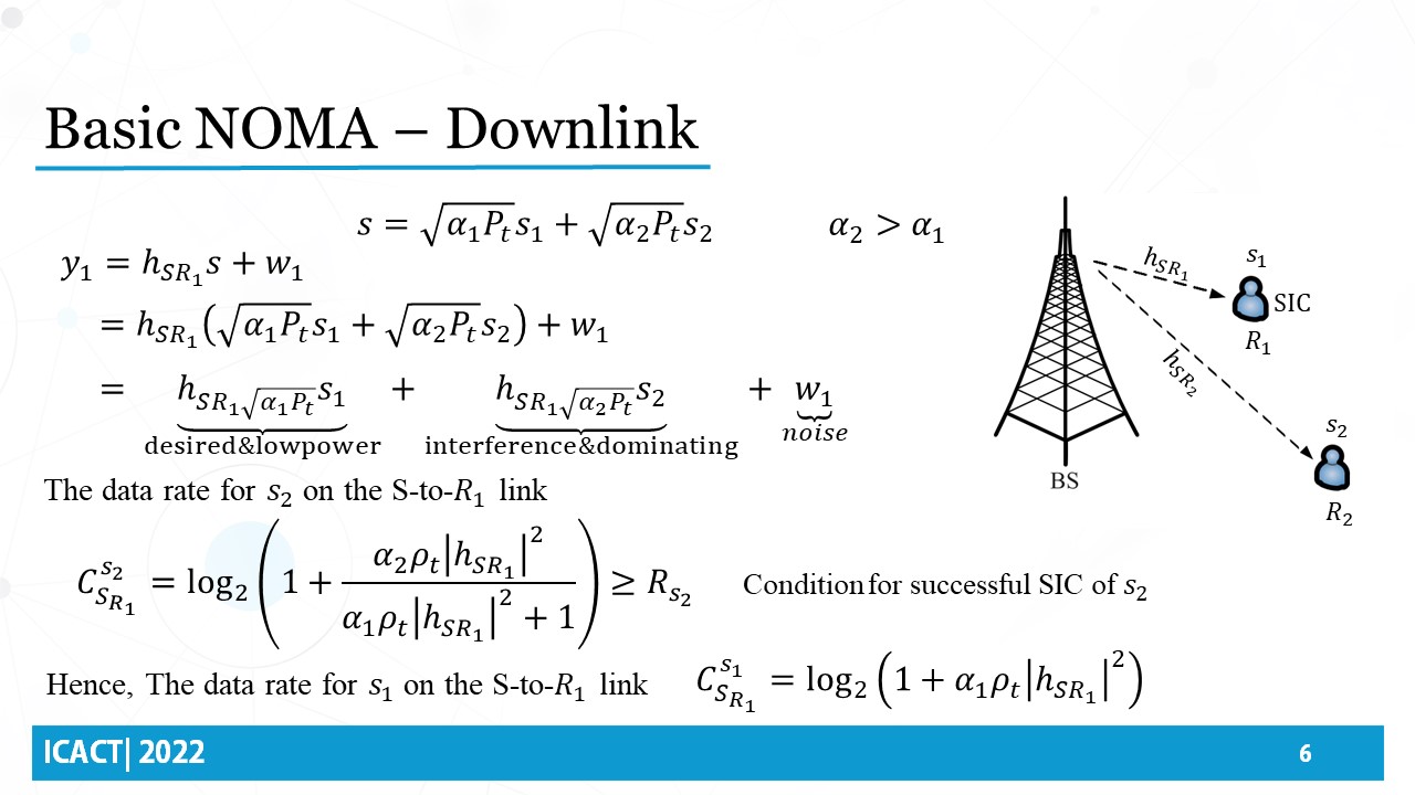 In the downlink NOMA phase, the source transmits a signal S representing two superimposed data symbols, s1 and s2. where alpha 1 and alpha 2 are the power allocation coefficients and Pt is the total transmission power from the base station source. It is assumed that the first symbol is to be extracted for forwarding at relay 1, while the second symbol at relay 2. It is also assumed that the first symbol is extracted at relay 1 through applying successive interference cancellation SIC by decoding symbol 2 first, while relay 2 decodes for symbol 2 directly. Hence, the power allocation coefficients must be such that alpha 2 greater than alpha 1. In order to consider symbol 2 successfully decoded at relay 1, the data rate for s2, on the source relay 1 link must be greater than the target data rate. Then, after performing SIC, The data rate for symbol 1 on source relay 1 link could be computed as the written equation.