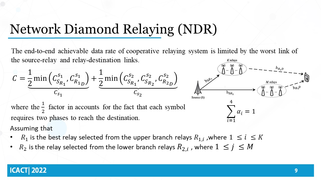 For NDR, with the two transmission phases, The end-to-end achievable data rate of the cooperative relaying system is limited by the worst link of the source-relay and relay-destination links. Hence it could be represented with the shown equation. Assuming that both relay 1 and relay 2 are the best-selected relays from two pools of relays in the upper and lower branches.