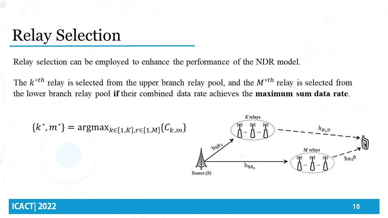 Relay selection can be employed to enhance the performance of the NDR model. The proposed model adopts a direct strategy in which the highest end-to-end sum achievable data rate is sought. The two relays from the two pools of relays in the upper and lower branches are selected if their combined data rate achieves the maximum sum data rate.