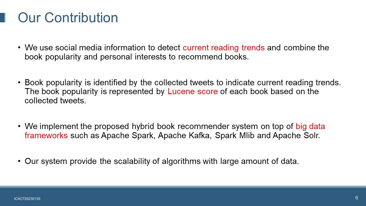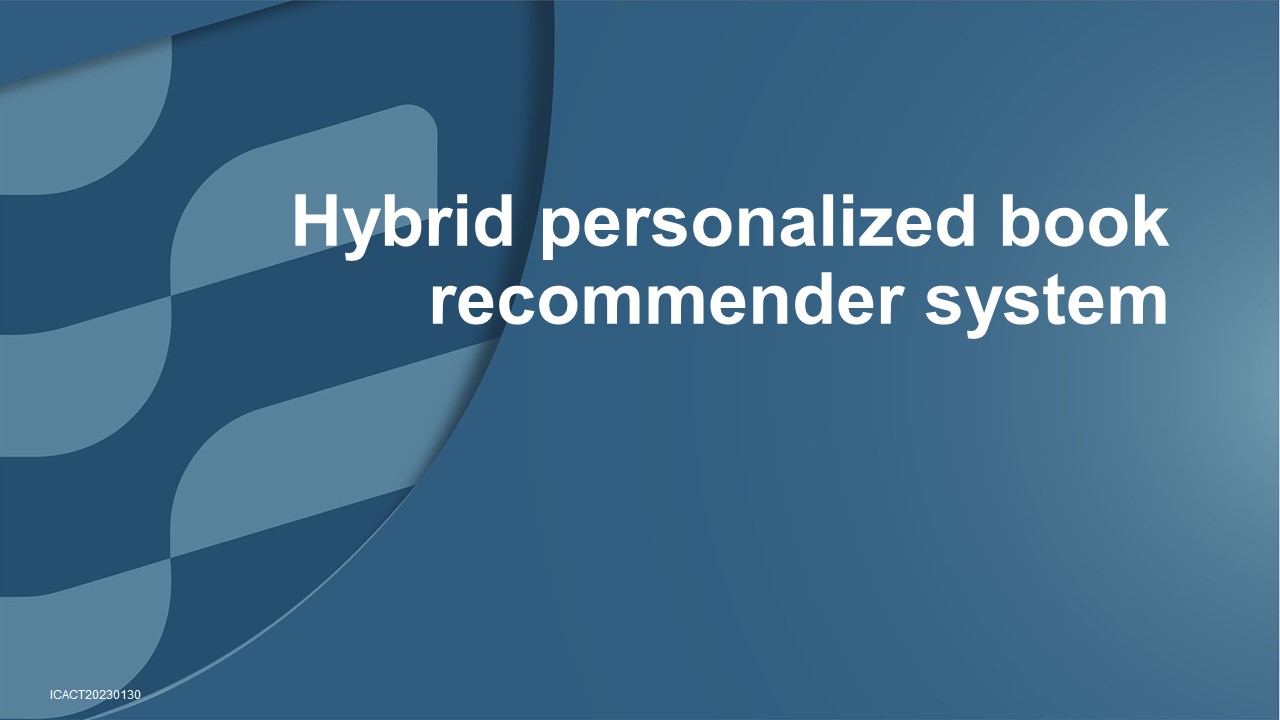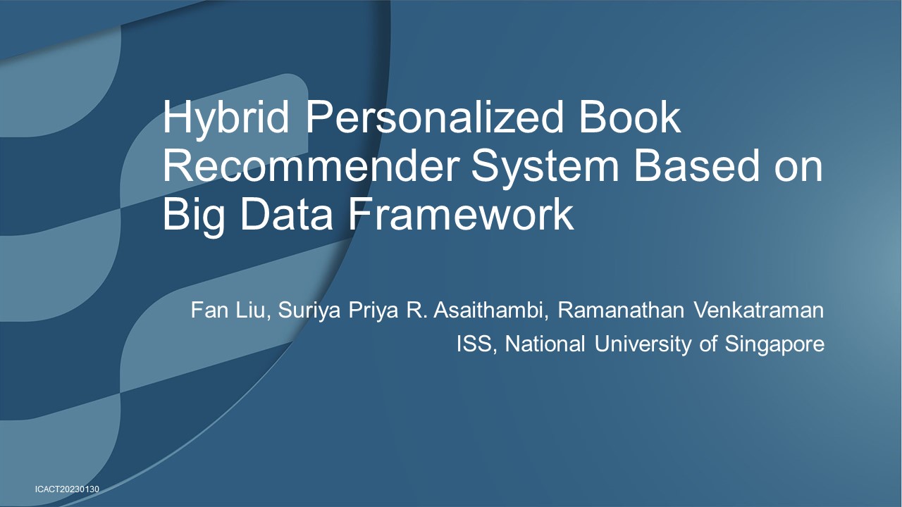 Hi everybody, my name is Liu Fan. I am current is a lecturer and consultant in ISS, National University of Singapore. For ICACT 2023, I have cooperated with two partners: Dr Suria and Dr Venkatraman. Our presentation today is about creating a hybrid personalized book recommender system based on big data framework.