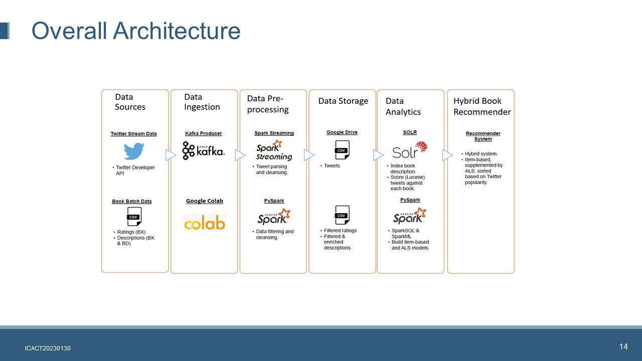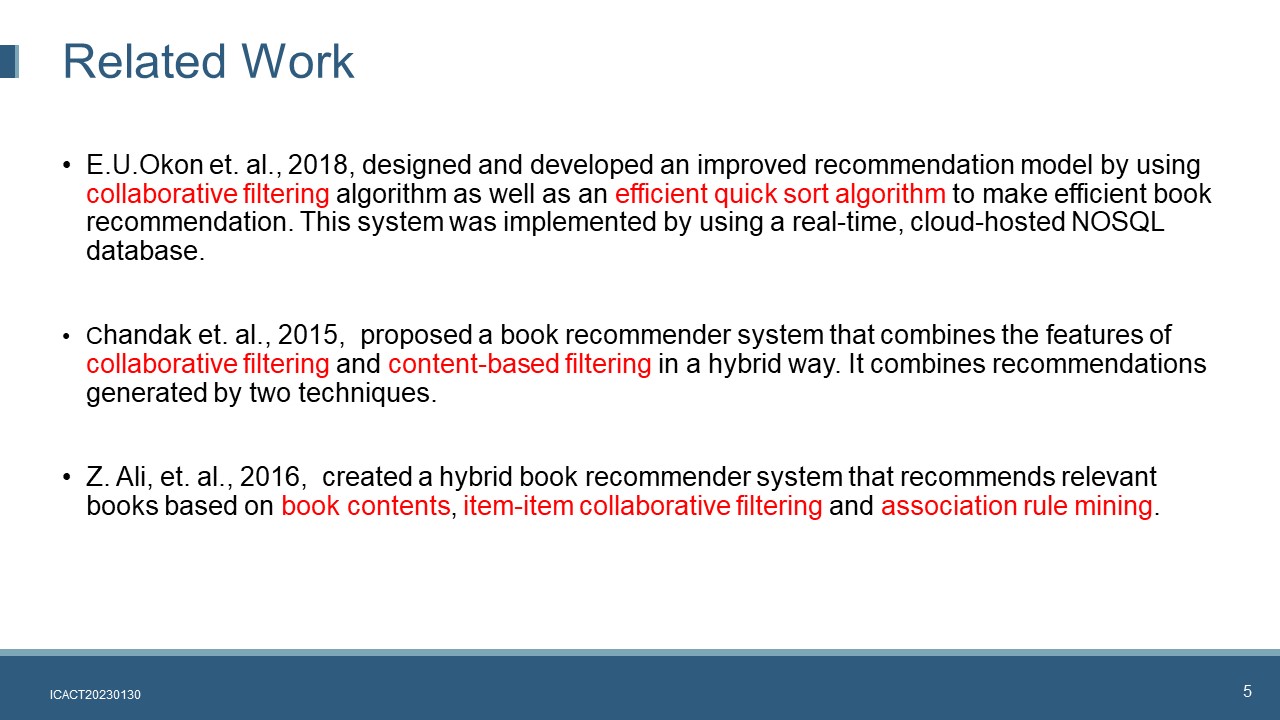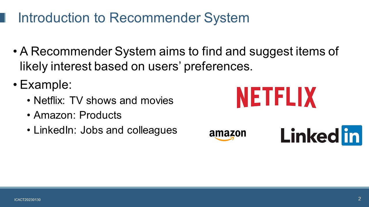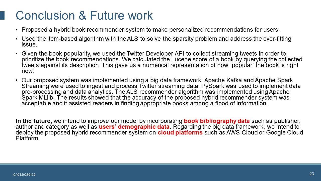 Hi everybody, my name is Liu Fan. I am current is a lecturer and consultant in ISS, National University of Singapore. For ICACT 2023, I have cooperated with two partners: Dr Suria and Dr Venkatraman. Our presentation today is about creating a hybrid personalized book recommender system based on big data framework.