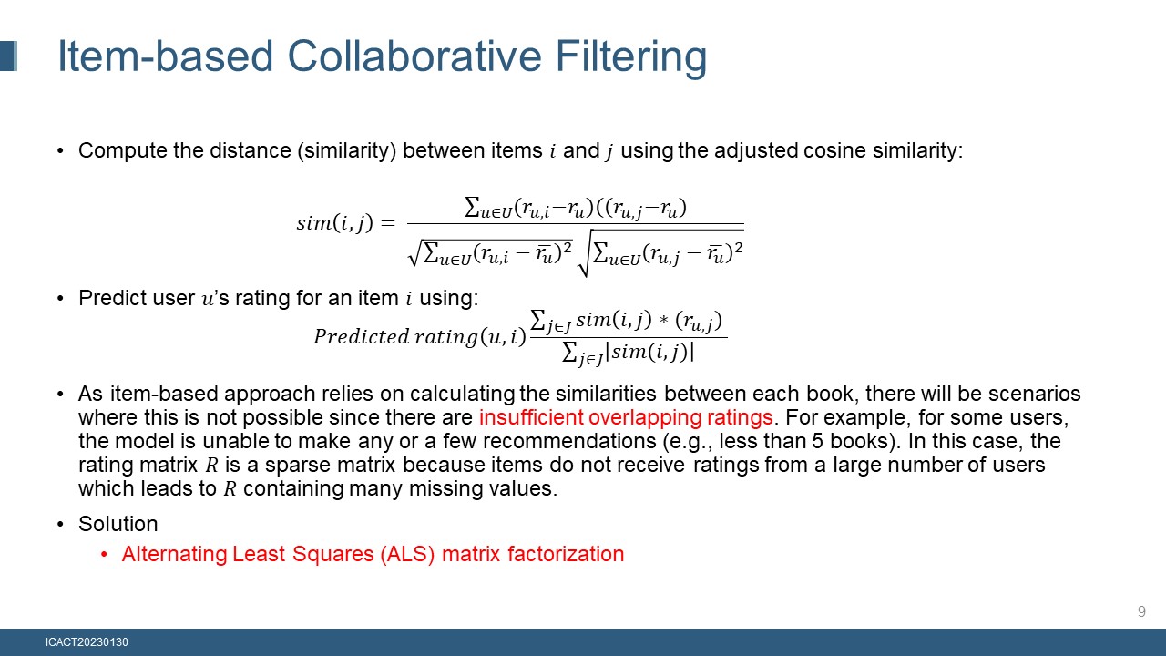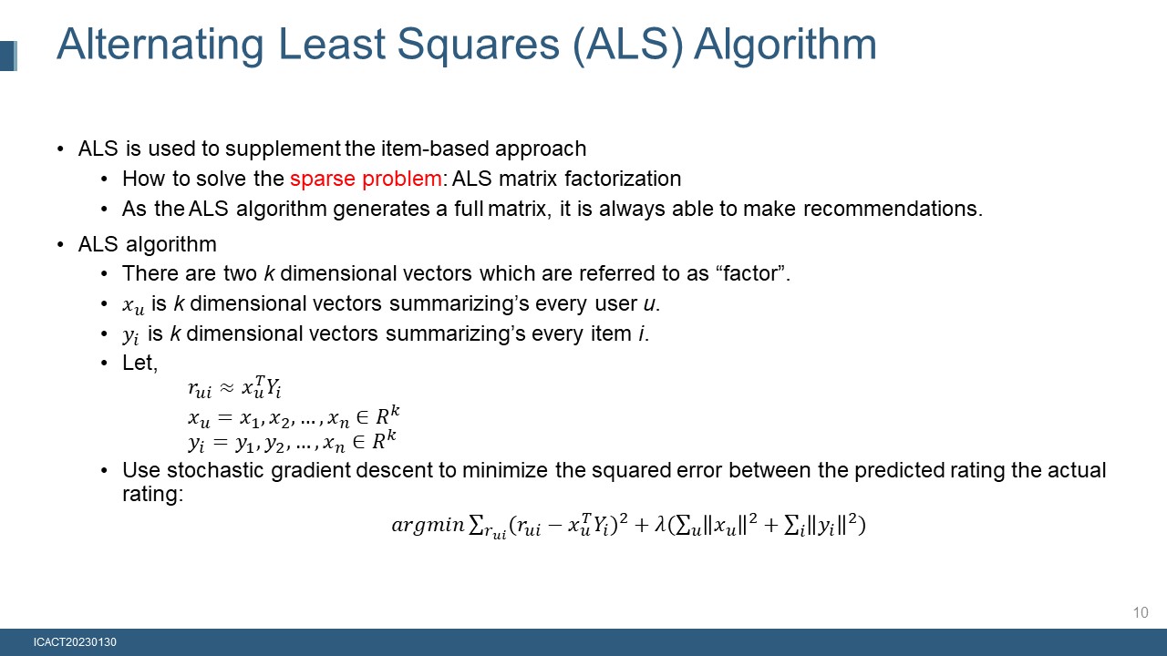 To address this issue, ALS approach is used to supplement the item-based approach. One solution to the sparse matrix problem is ALS matrix factorization.