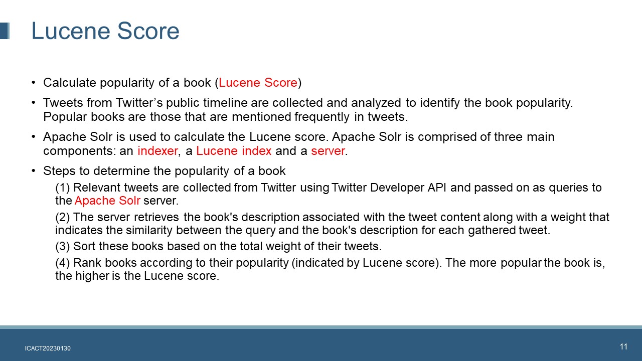 Apache Solr is used to calculate the Lucene score. Apache Solr is comprised of three main components: an indexer, a Lucene index and a server . To determine the popularity of a book, relevant tweets are collected from Twitter using Twitter Developer API and passed on as queries to the Apache Solr server. The server retrieves the book's description associated with the tweet content along with a weight that indicates the similarity between the query and the book's description for each gathered tweet. These books are sorted based on the total weight of their tweets. As a result, the books are ranked according to their popularity (indicated by Lucene score). The more popular the book is, the higher is the Lucene score.