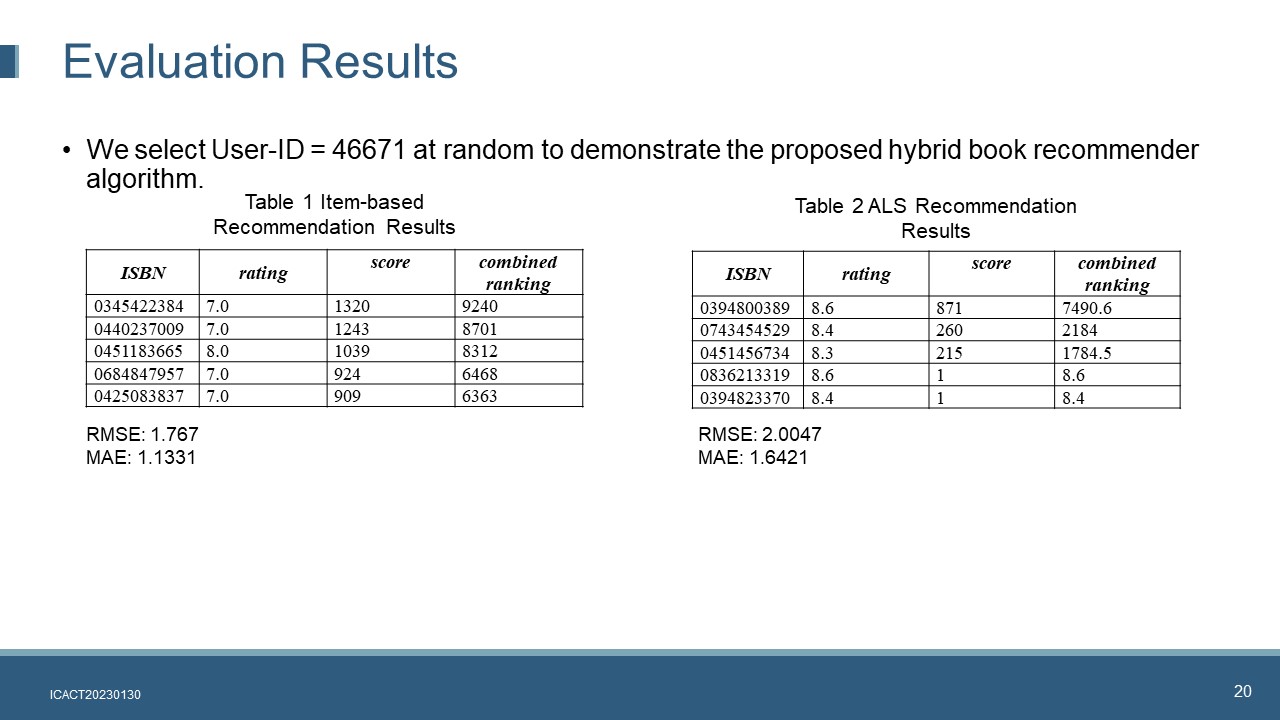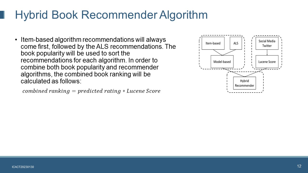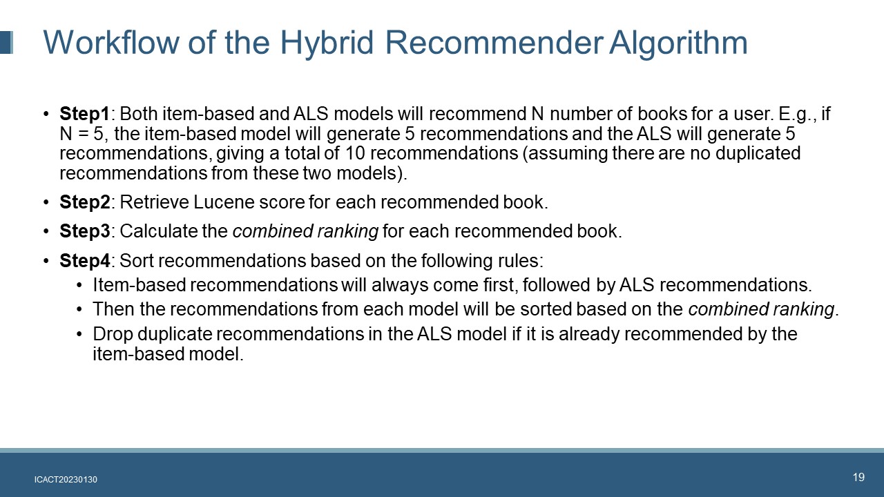 In summary, in the hybrid book recommender system, item-based algorithm recommendations will always come first, followed by the ALS recommendations. The book popularity will be used to sort the recommendations for each algorithm. In order to combine both book popularity and recommender algorithms, the combined book ranking will be calculated by considering both the model-based algorithms as well as the book popularity. Recommendation list generated by each algorithm will be sorted based on the combined ranking.