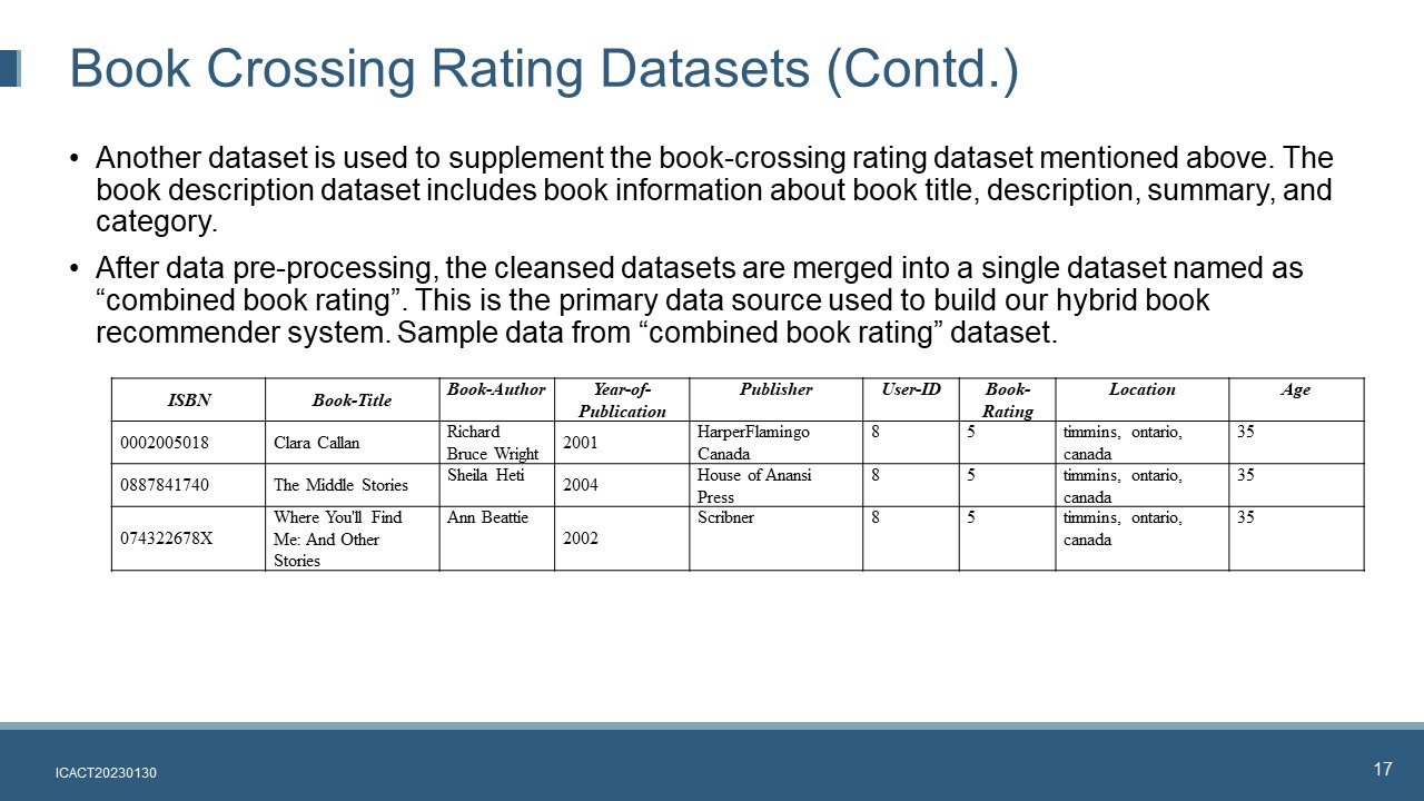 After data pre-processing, the cleansed datasets are merged into a single dataset named as ¡°combined book rating¡±. This is the primary data source used to build our hybrid book recommender system. Sample data from ¡°combined book rating¡± dataset.