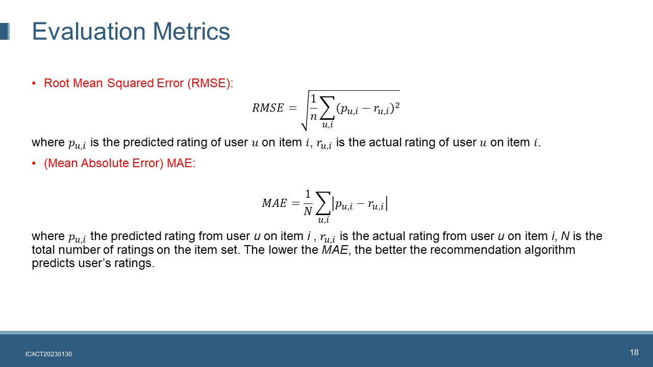 In the MAS calculation formula, 𝑝_(𝑢,𝑖) the predicted rating from user u on item i , 𝑟_(𝑢,𝑖) is the actual rating from user u on item i, N is the total number of ratings on the item set. The lower the MAE, the better the recommendation algorithm predicts user¡¯s ratings.