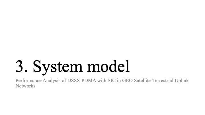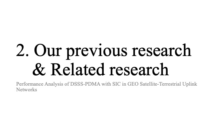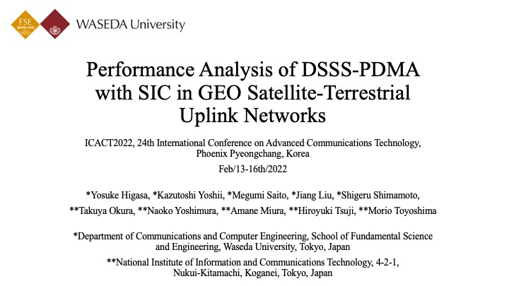 Hello everyone, my name is Yosuke Higasa from Waseda University. Today, I will talk about Performance Analysis of DSSS-PDMA with SIC in GEO Satellite-Terrestrial Uplink Networks.