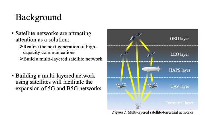 So, let me begin by talking about our research background. Satellite networks are attracting attention as a solution to realize the next generation of high-capacity communications by linking the terrestrial networks and the non-terrestrial networks. A single satellite station can cover a very large area of ground, reducing the cost of capital investment for ground stations and facilitating the expansion of the network to rural and developing areas.