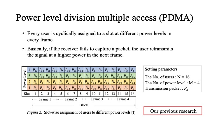 The two central technologies of this paper are described in this section. In the PDMA scheme, every user is cyclically assigned to a slot at different power levels in every frame. Users with the highest power levels are given the highest priority for demodulation. If a user with a lower power level fails to demodulate, the probability of success is increased by allocating higher power in the next frame.