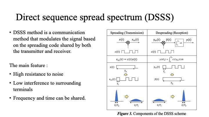 DSSS method is a communication method that modulates the signal based on the spreading code shared by both the transmitter and receiver. By applying DSSS processing to the signal, the power spectral density is reduced and becomes closer to noise. This has the advantage of reducing the peak power of the signal and mitigating the interference effects on surrounding users.