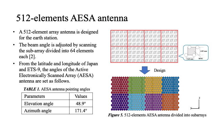In our proposed model, we assume that we will communicate with a high throughput satellite named ETS-9, which is scheduled to be launched in Japan. Therefore, we will first design a five hundred twelve-element array antenna that satisfies the requirements of ETS-9. As shown in Figure 5, the beam angle is adjusted by scanning the sub-array divided into sixty-four elements each. From the latitude and longitude of ETS-9 and Japan, we can calculate the elevation angle and azimuth angle of the ground AESA antenna to be forty-eight point seven degrees and one hundred seventy-one point four degrees, respectively.