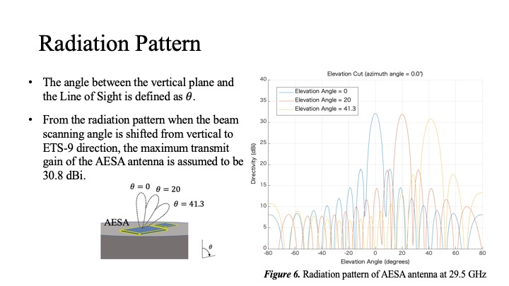 Since the AESA antenna will be installed vertically, the beam scanning angle should be set to forty-one point three degrees. The radiation pattern is shown when the beam scanning angle is shifted from vertical to ETS-9 direction. Assuming no pointing loss, the maximum transmit gain of the AESA antenna is calculated to be thirty point eight dBi.
