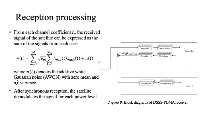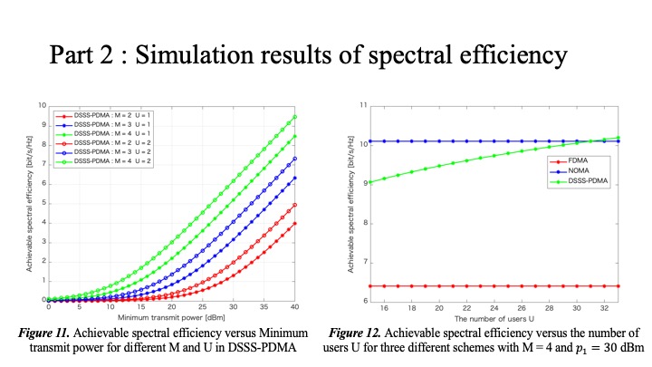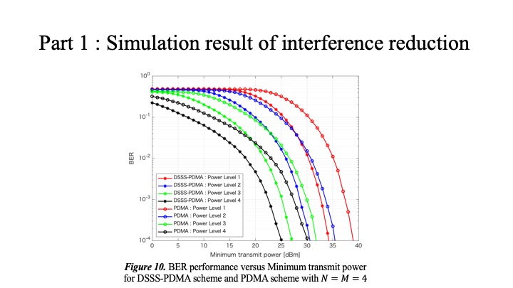 Finally, I will summarize our simulation results. By applying the DSSS-PDMA scheme for satellite-terrestrial communication, the transmission peak power can be reduced and a higher spectral efficiency can be achieved than the existing schemes. In our future work, more complex techniques will be introduced in the proposed model to evaluate the reception quality. After further research, we will demonstrate geostationary orbit satellite-terrestrial communication by introducing the DSSS-PDMA scheme.