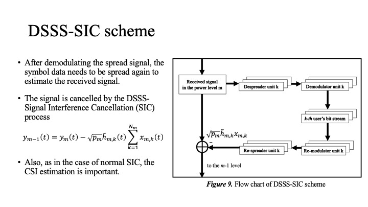 In our proposed model, the signal is demodulated using the DSSS-SIC scheme, which adds DSSS to the normal SIC method. First, the received signal is despread following the normal CDMA decoding to demodulate a cluster of users with power level m. Then, the signal of each user is re-modulated and re-spread just like the transmitter to reproduce the received signal. Finally, the received signal is cancelled with all the received signals of power level m. This is repeated for the number of power level divisions.