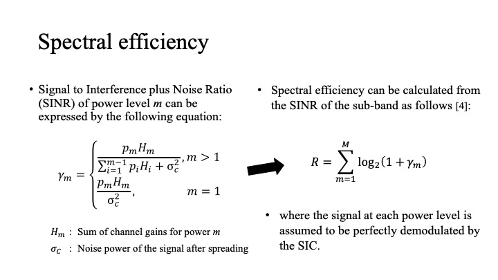 The SINR of the signal for a group of users with large power levels has noise component and interference components of signals with smaller power levels. When the signals are demodulated by the DSSS-SIC technique in order and the signals are assumed to be perfectly cancelled, the SINR of users with the lowest power levels have only noise component. The spectral efficiency is calculated from SINR of the sub-band based on Shannon Hartley's theorem.
