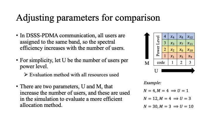 In DSSS-PDMA communication, all users are assigned to the same band, so the spectral efficiency increases with the number of users. For simplicity, let U be the number of users per power level. We examine the relationship between the spectral efficiency by increasing the number of users to be assigned, that is, by increasing U and M.